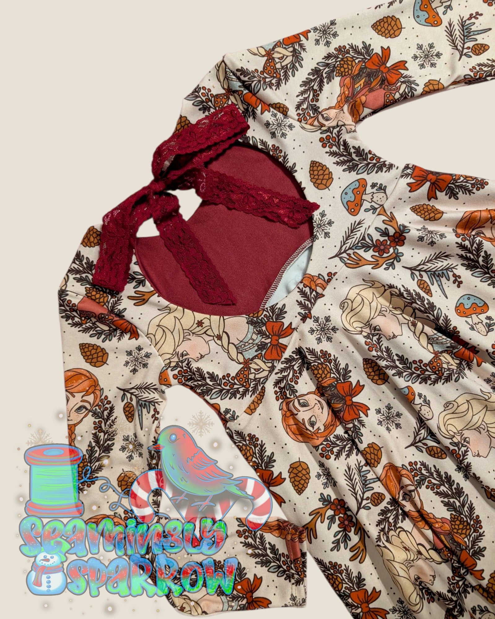 Long Sleeve Aspen Dress in the Festive Sisters print, keyhole back featuring a wine colored lace tie. Made with soft and cozy mid-weight DBP.