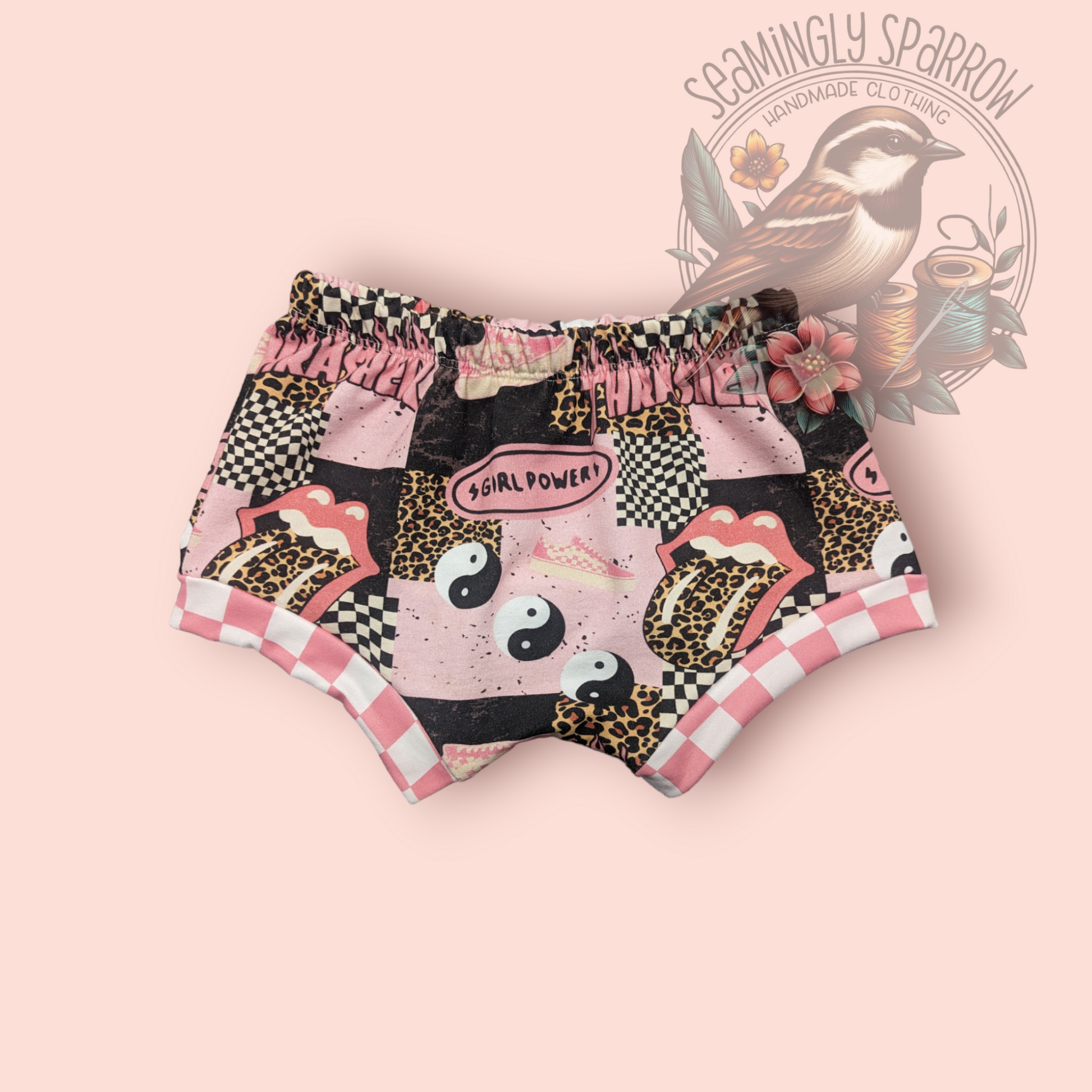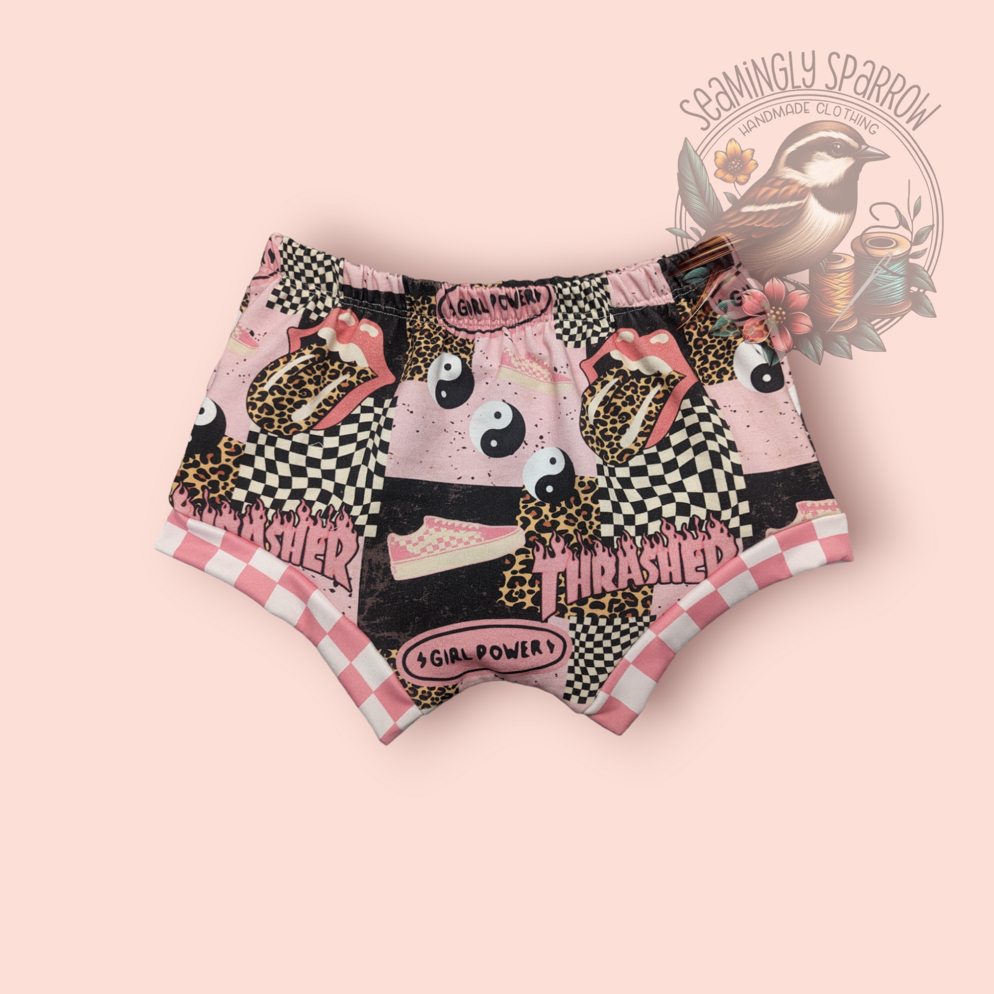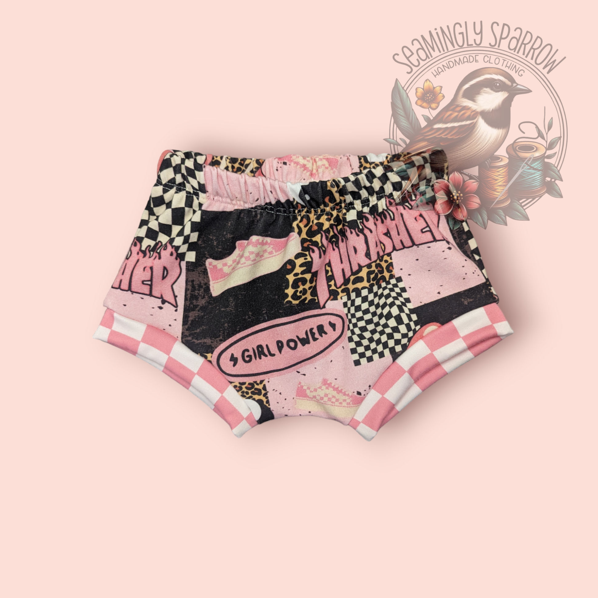Pink Thrasher Print Shorties. Cotton French Terry fabric. These are a more relaxed fit so littles tend to get full age range for wear (or more).